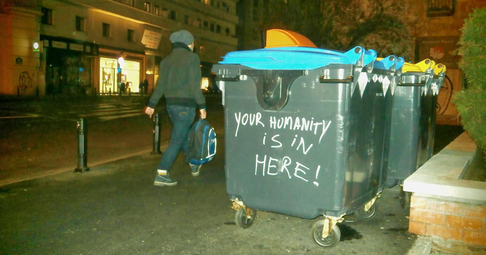 contrasting scenes - an ignorant man with an absent gaze, in a toxic urban